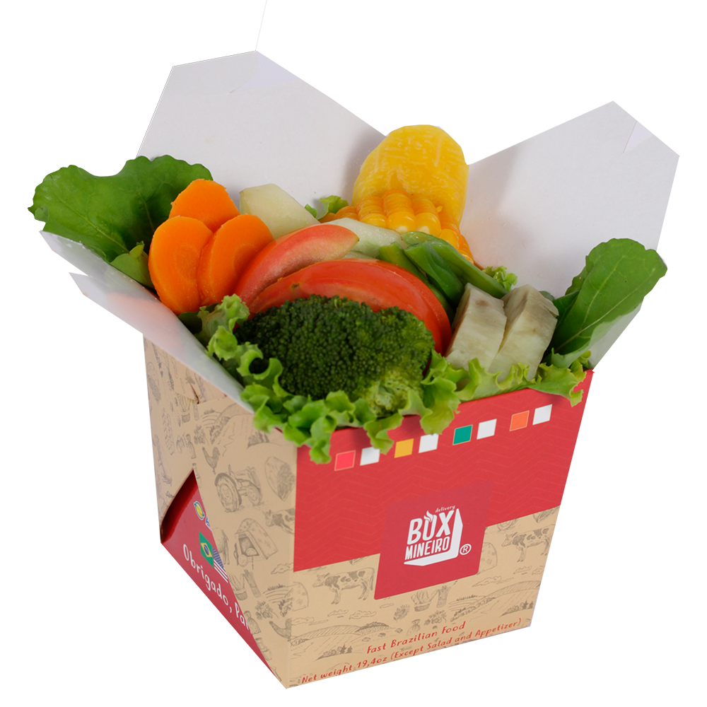 Lechuga, zanahoria, pepino, plátano macho, brócoli, papa, camote, ejote, elote en trozos, pollo en tiras asado, jitomate, arúgula, melón y aderezo especial
