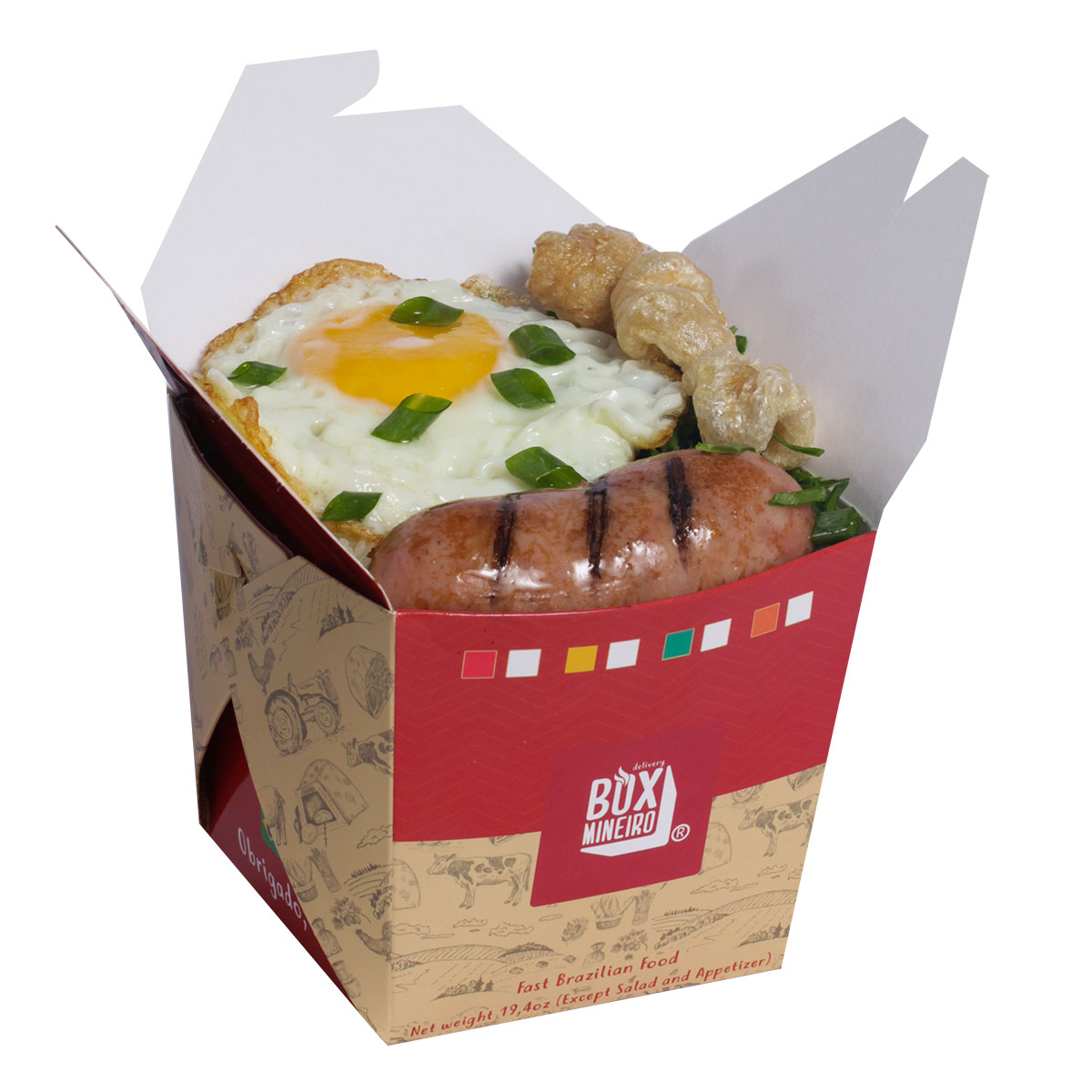 Arroz, linguiça toscana, chicharrón, huevo, pure de jitomate especial, tocino, cebolla, acelga y cebollín. – El Box Tradicional contiene 550g.