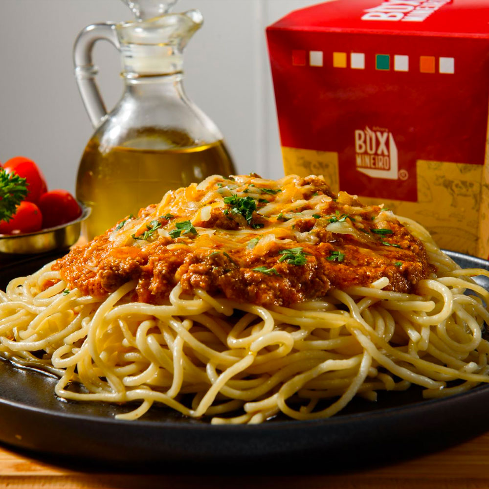 Pasta spaghetti, carne molida, salsa de jitomate, cebolla, queso mozzarella, perejil, cebollín y orégano