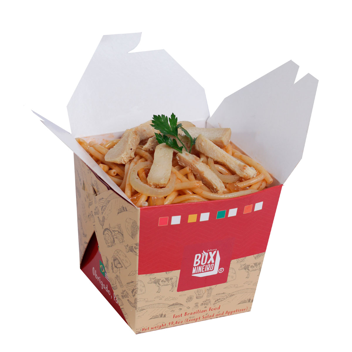 Macarrón, tiras de pollo , extracto de tomate, tocino, cebolla, pimenta , ajo, perejil y cebollín. – El Box Tradicional contiene 550g.